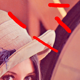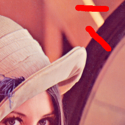 Each inpainted pixel is filled with a color calculated as a weighted average of all already known (i.e. those outside of the inpainting range or those that were already) pixels withing a range specified by the parameter inRange. Using a higher range will result in smoother edges withing the inpainted region. The calculation of the weights is done by analyzing the coherence flow of the input image which is previously smoothed with a gaussian kernel with the standard deviation given in inPreSmoothing. This means that lower values of this parameter will result in more detail being preserved but it may also introduce unwanted artifacts. After computing the coherence direction and strength, those values are also smoothed to allow for better preservation of angled edges. This smoothing is done using a kernel with the standard deviation given in inPostSmoothing. Higher values of this parameter higher quality estimation of angles within the inpainted region but it will also increase the work time of this filter. Additionally one can specify how important the coherence flow information is by using the inSharpness parameter (Setting inSharpness to zero will mean that coherence information is to be ignored). Higher values will stress the importance of preserving the structure of the inpainted image and will result in sharper edges.
