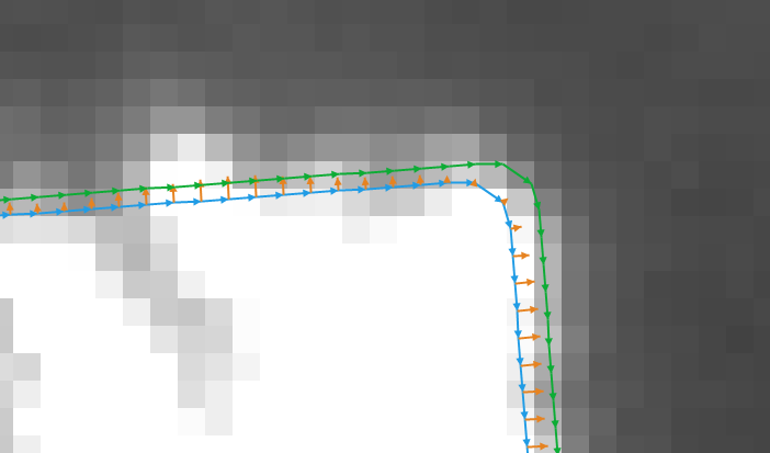 • The inAttractionRadius should be set to the average initial distance between inPaths and edges of the input image. Although the filter tolerance to this parameter is high, setting it too low may result in adjustment failure, setting it too high will result in reduced accuracy. The parameter directly influences attraction vectors, which may be observed via diagnostic output diagAttractionVectors.