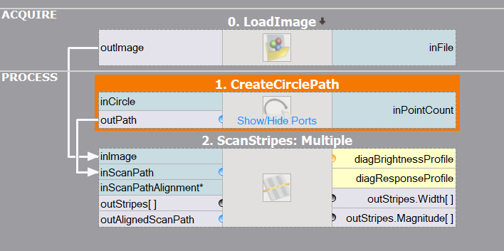 We will solve this problem running a single 1D Edge Detection scan along a circular path intersecting the blades, and therefore we need to produce appropriate circular path. For that we will use a straightforward CreateCirclePath filter. The built-in editor will allow us to point & click the required inCircle parameter.