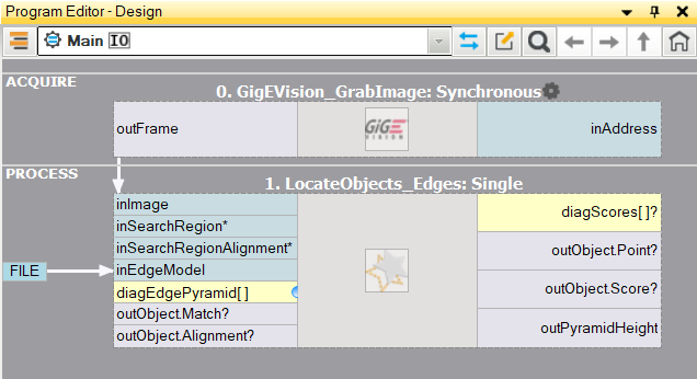 Please note that the use of CreateGrayModel and CreateEdgeModel2 filters will only be necessary in more advanced applications. Otherwise it is enough to use a single filter of the Matching step and create the model by setting the inGrayModel or inEdgeModel parameter of the filter. The CreateEdgeModel2 and LocateMultipleObjects_Edges2 filters are preferred over CreateEdgeModel1 and LocateMultipleObjects_Edges1 because they are newer, more advanced versions with more capabilities.