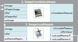 It is quite easy to express the described method in Aurora Vision Studio - we will need just two built-in filters. We will compute the template correlation image using the ImageCorrelationImage filter, and then identify the matches using ImageLocalMaxima - we just need to set the inMinValue parameter that will cut-off the weak local maxima from the results, as discussed in previous section.